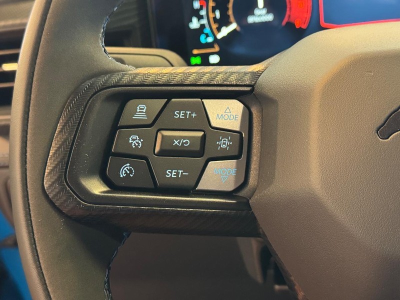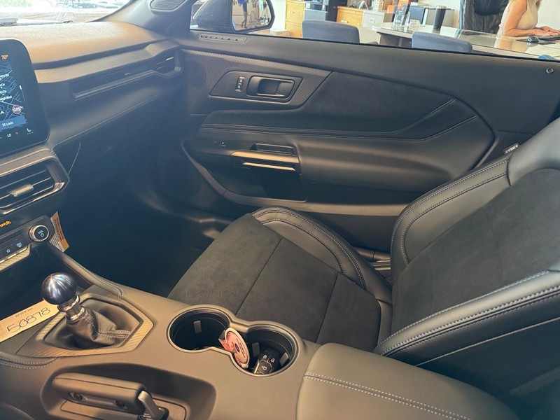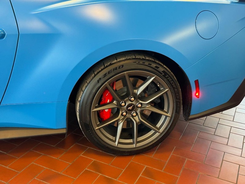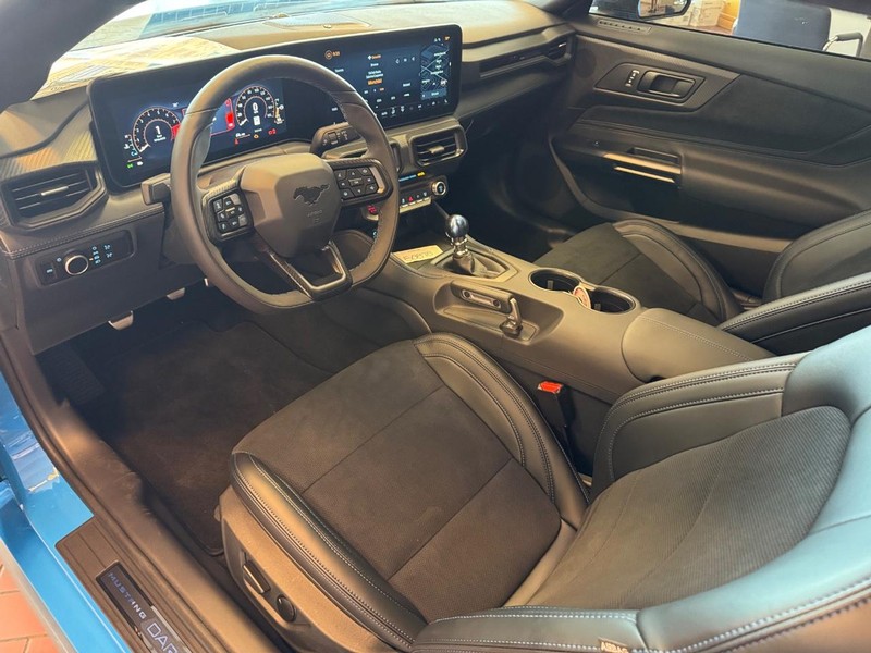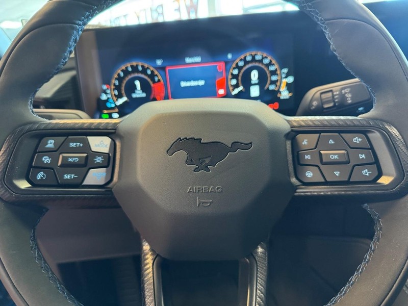 More exclusives highlight our Dark Horse cabin, which showcases heated cloth power front seats, a heated leather flat-bottom steering wheel, dual-zone automatic climate control, keyless access/ignition, black pedals, and an eye-catching Titanium Anodized Blue shifter knob. The digital dash incorporates a 12.4-inch driver display and a 13.2-inch touchscreen to support Track Apps, wireless charging, connected navigation, WiFi compatibility, Android Auto/Apple CarPlay, Bluetooth, and Bang & Olufsen audio.